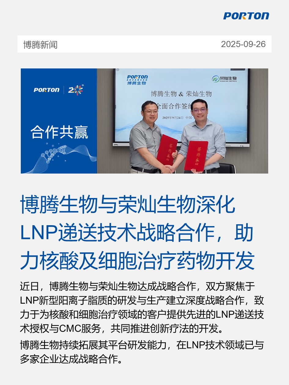 博腾生物与荣灿生物深化LNP递送技术战略合作,为核酸和细胞治疗领域客户提供先进技术和产业化服务,加速创新药物研发进程。