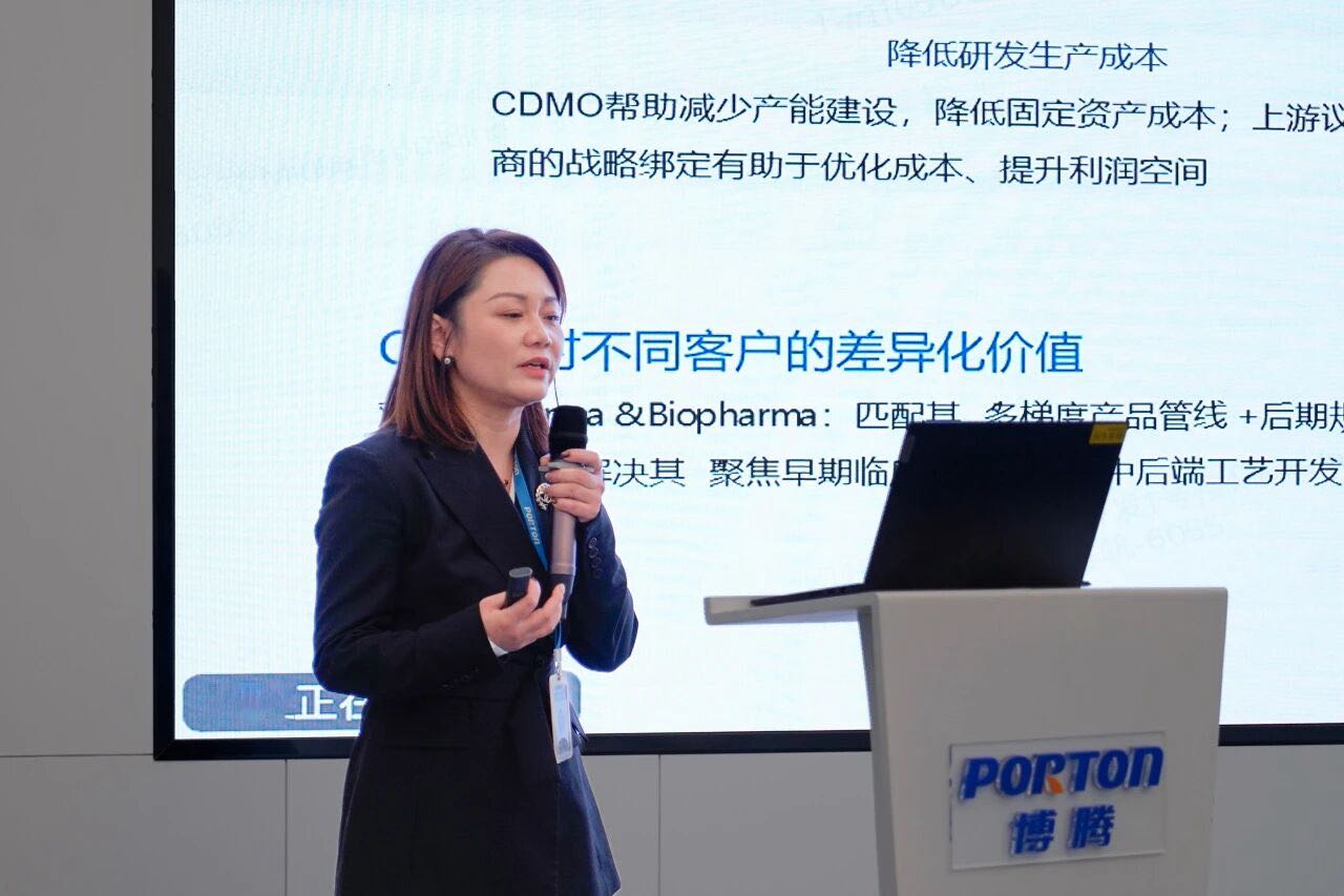 主题报告环节,博腾副总经理孟凡女士聚焦 CDMO 在医药创新生态中的枢纽作用发表主旨演讲,她强调科技创新是博腾立足行业的核心竞争力,面对全球医药产业 “专业化、精细化、定制化” 分工趋势,博腾深耕连续化反应、生物催化、AI 辅助工艺设计等前沿技术领域,搭建起覆盖化学小分子、多肽 / 寡核苷酸、蛋白与偶联药物、细胞与基因治疗的全技术平台,可提供从临床前到商业化的全生命周期解决方案。