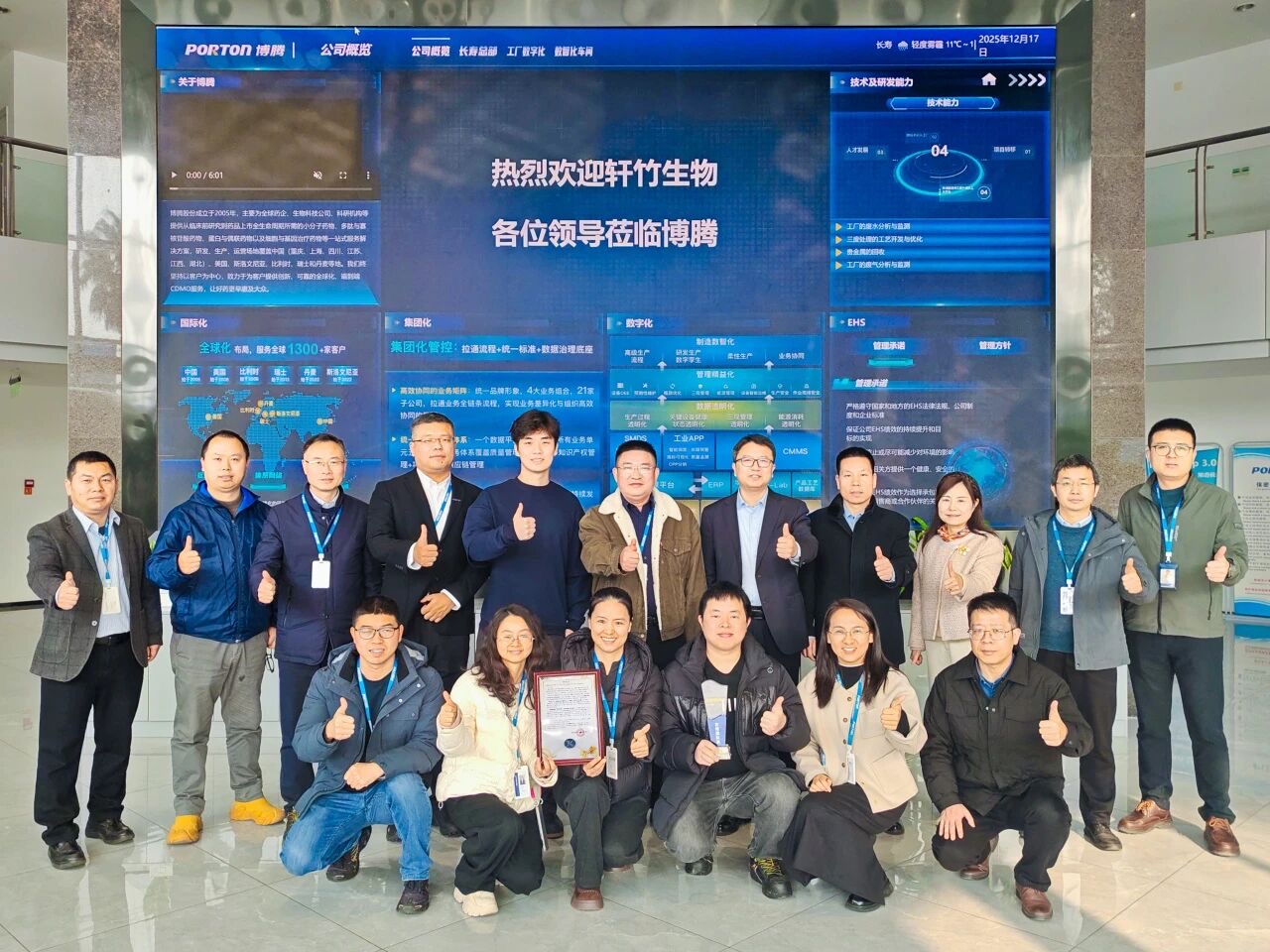 2025年12月17日,轩竹生物科技股份有限公司(以下简称“轩竹生物”)董事长助理携项目核心团队莅临博腾股份,为博腾地罗阿克项目组授予“优秀团队奖”并现场递交感谢信,以此表彰博腾在该药品项目中提供的卓越服务。博腾股份高级副总经理兼首席运营官白银春、长寿工厂副总经理龙伟刚、小分子新药研发中心工艺研发部执行总监陈岩博士出席了此次颁奖仪式。
