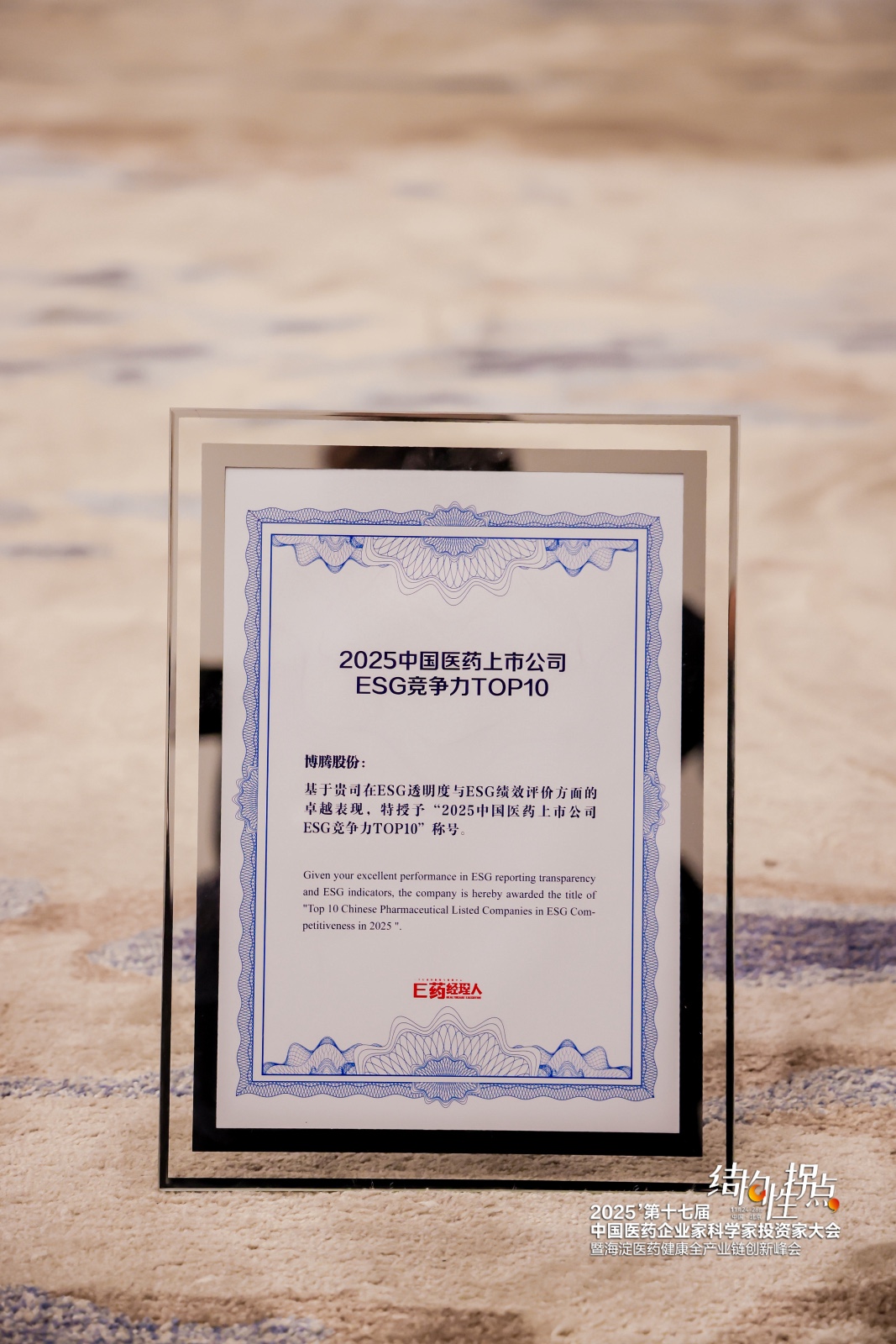 2025年11月24-26日,由中国医药企业管理协会、E药经理人等联合主办的“2025’第十七届中国医药企业家科学家投资家大会(2025启思会)”在北京召开。博腾股份受邀参会并收获双重荣誉,成功入选“十四五”中国医药产业优质供应商100强,同时荣登“2025中国医药上市公司ESG竞争力TOP10(小盘股)”榜单,以产业服务与可持续发展的卓越表现,获得行业权威高度认可。
